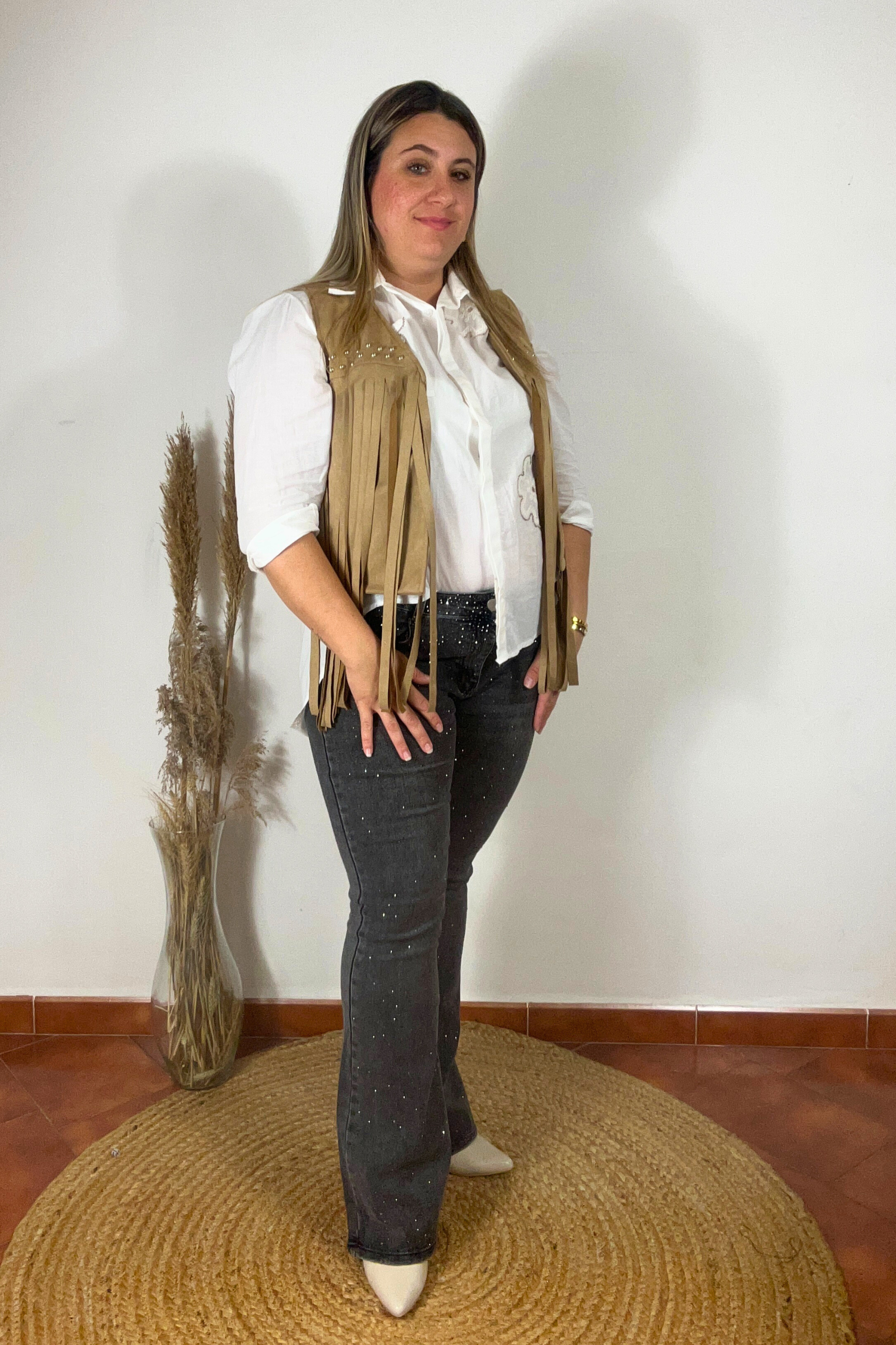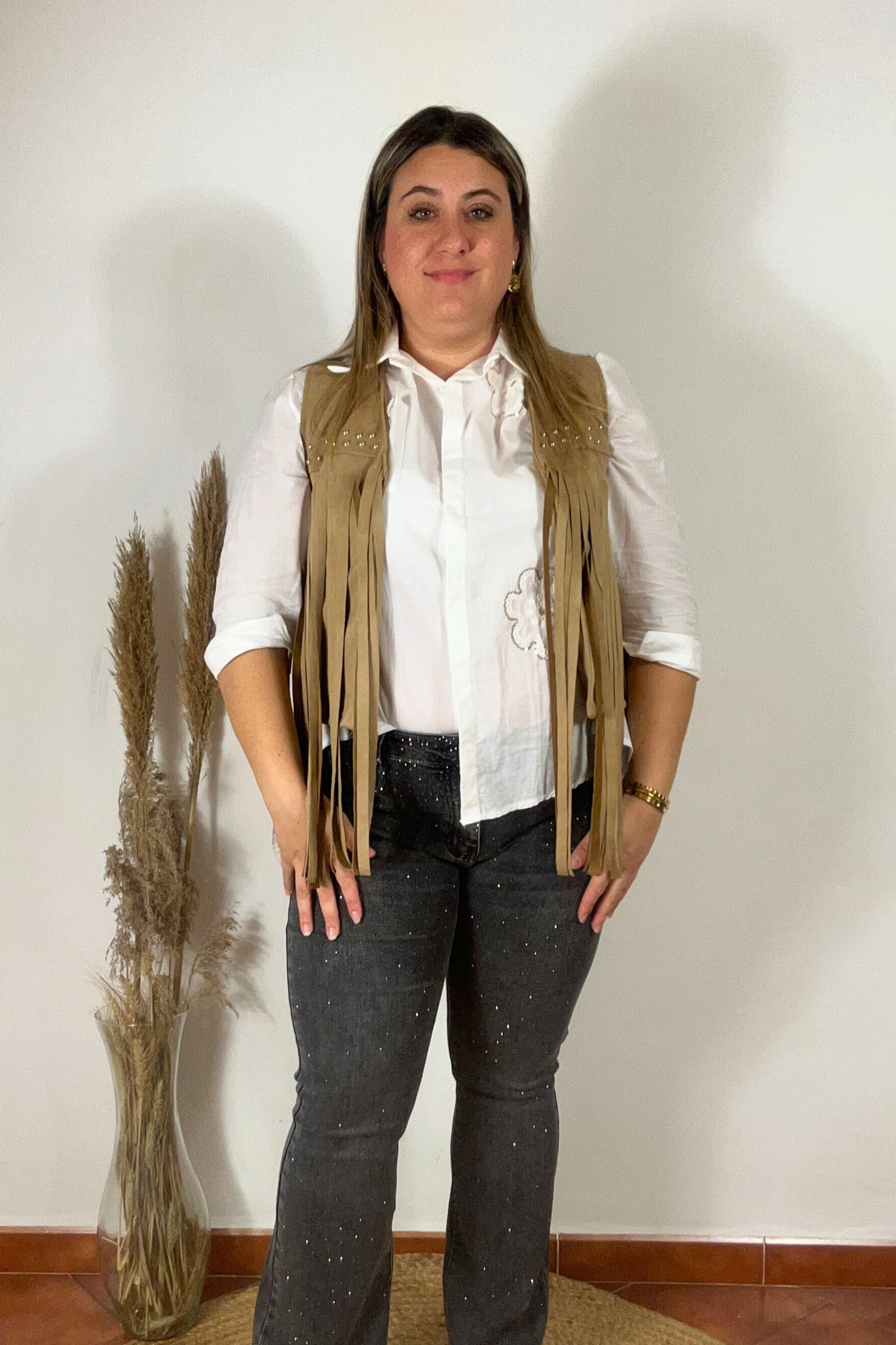 De ante suave, con flecos frontales y tachuelas decorativas en el pecho, esta prenda tiene ese toque boho-chic que transforma cualquier look. Súper combinable y con una caída preciosa.