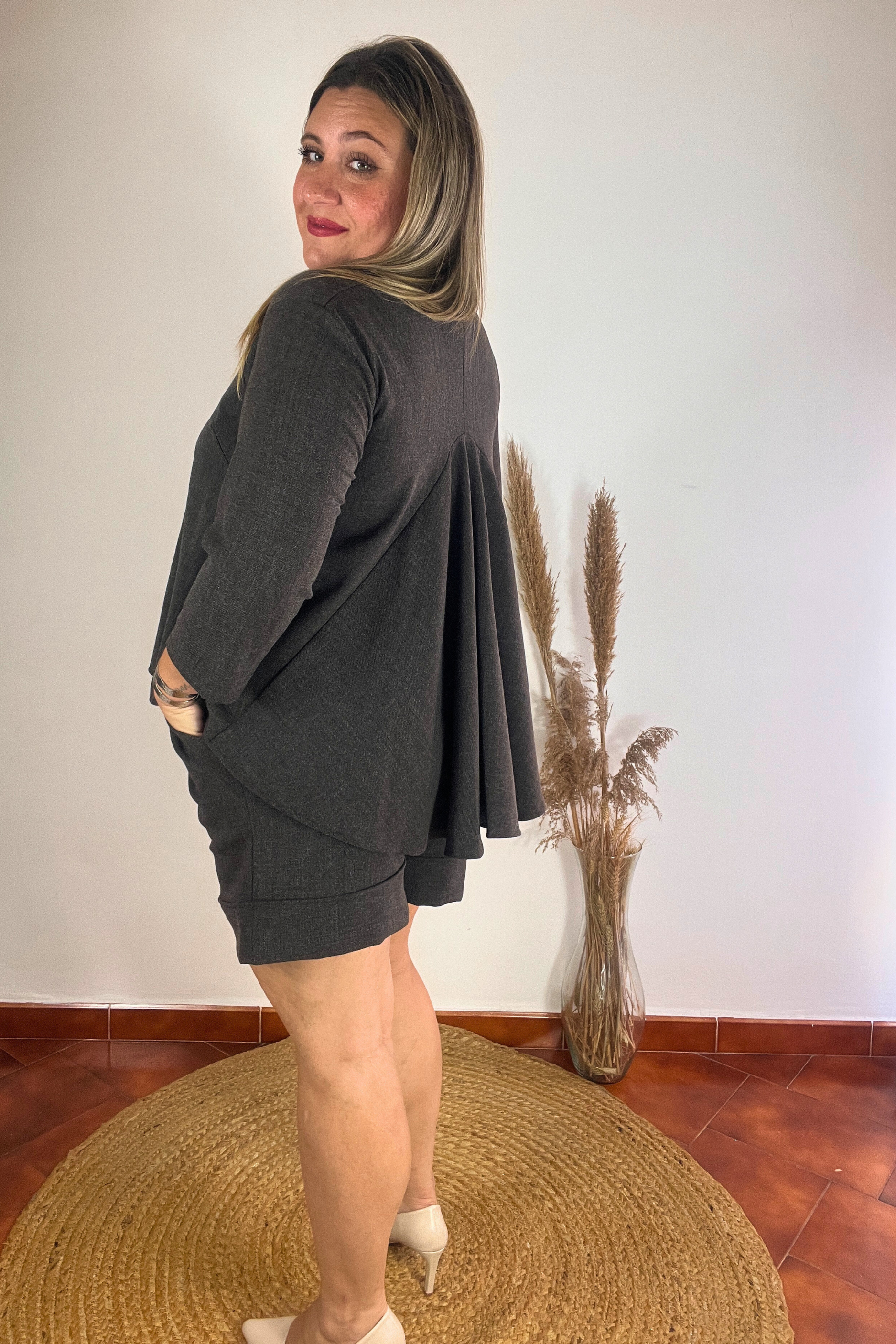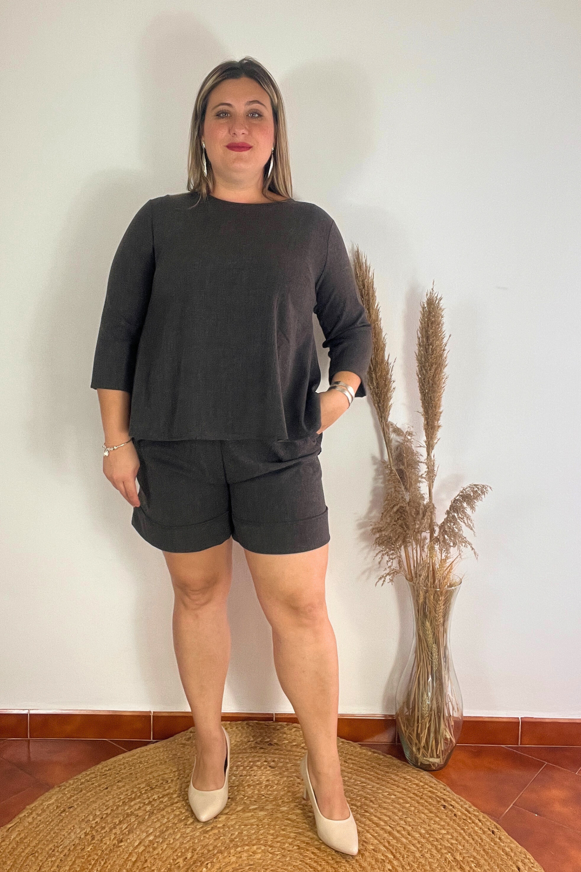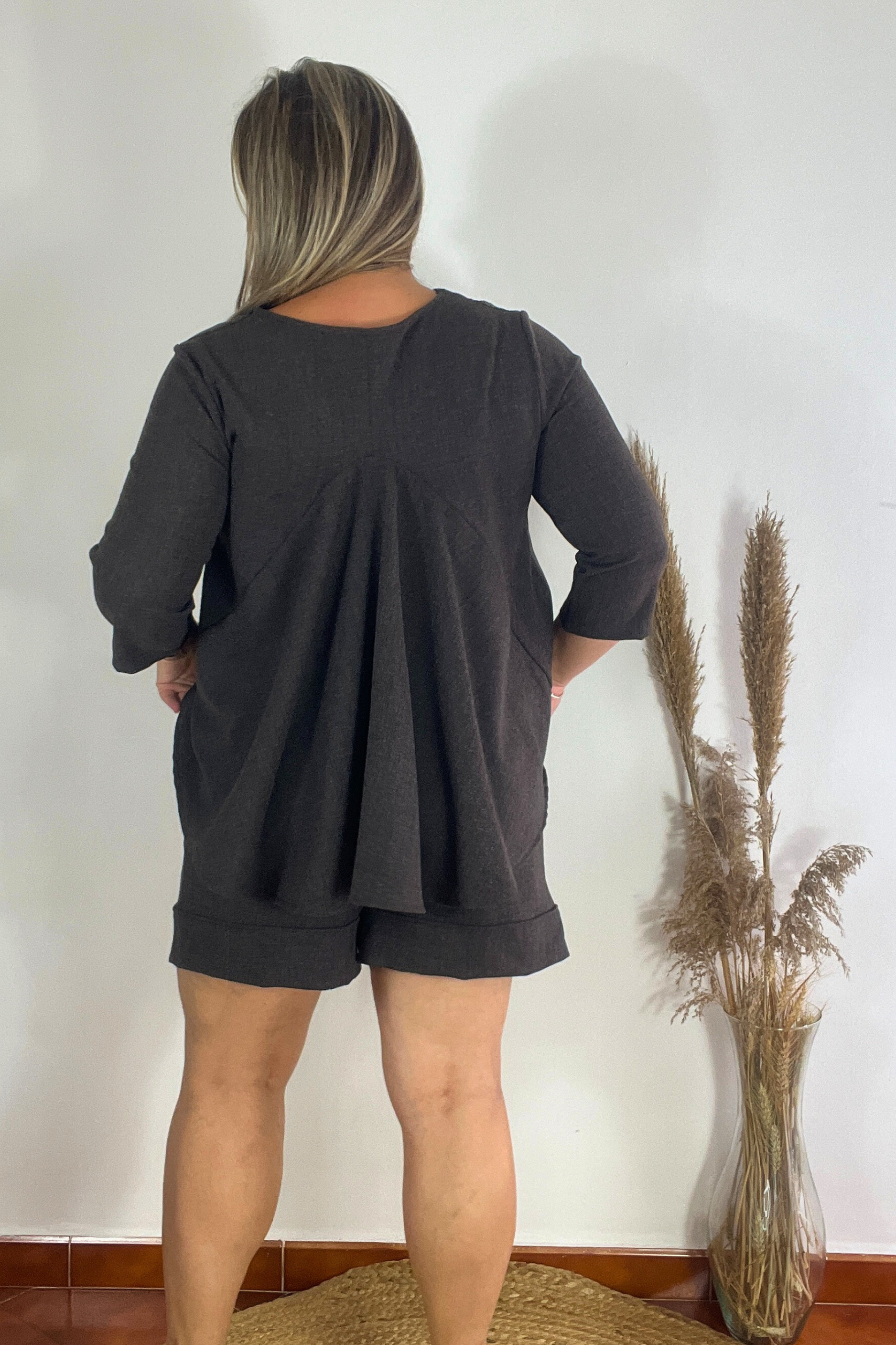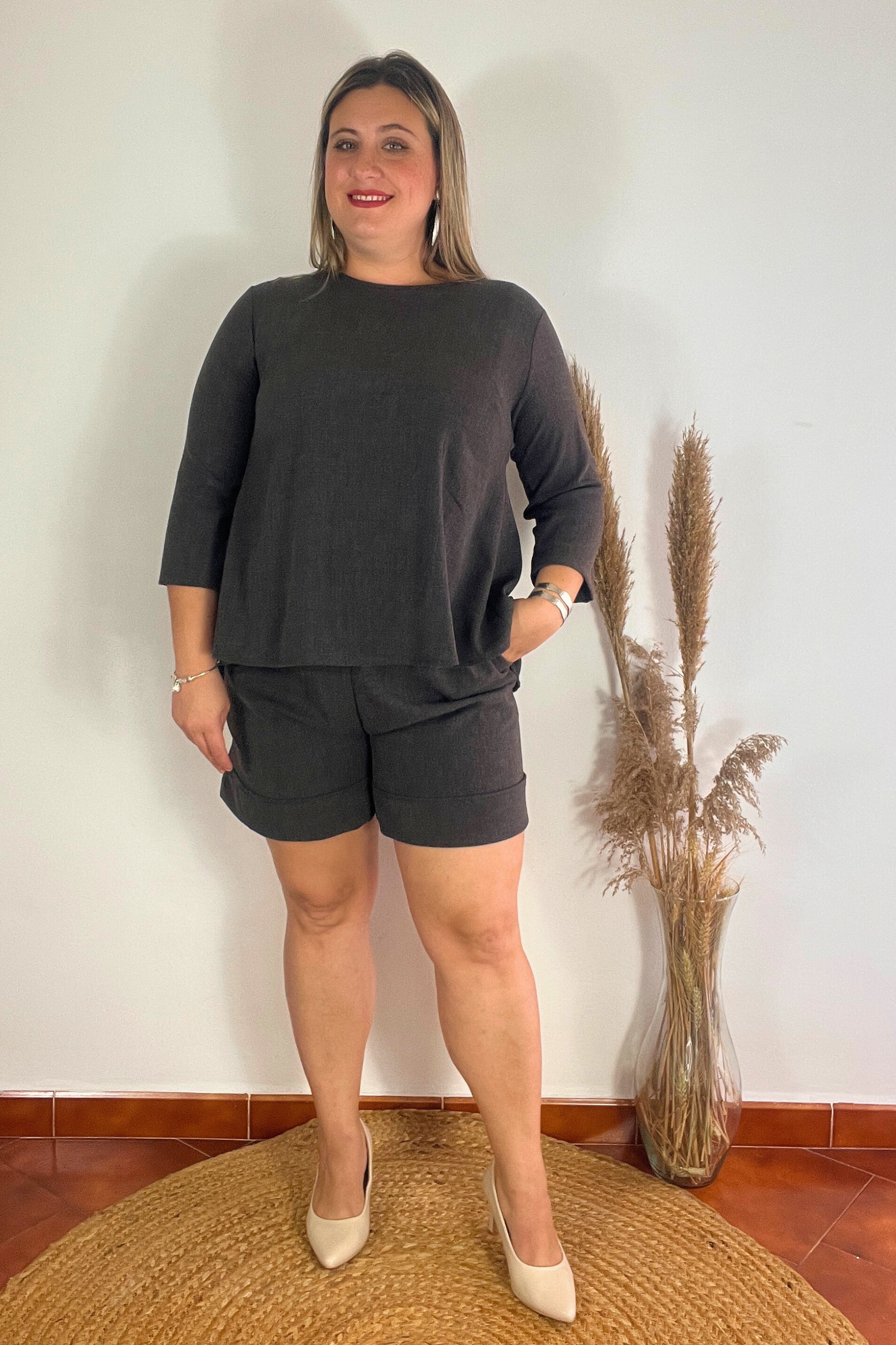 Un dos piezas cómodas y con estilo: pantalón corto con goma en la cintura para un ajuste perfecto, acompañado de una parte superior con delicada apertura en la espalda que aporta un toque especial y favorecedor.