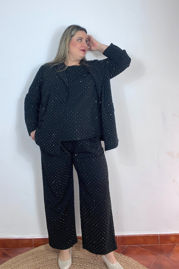 Elegante conjunto traje compuesto por americana y pantalón, totalmente repleto de brillos para un look sofisticado y espectacular.