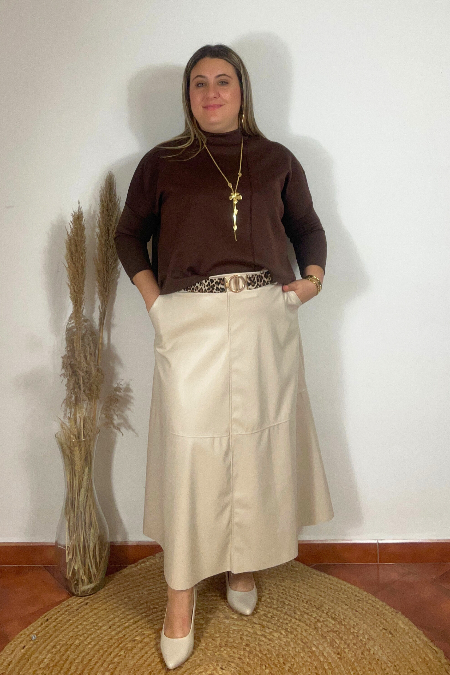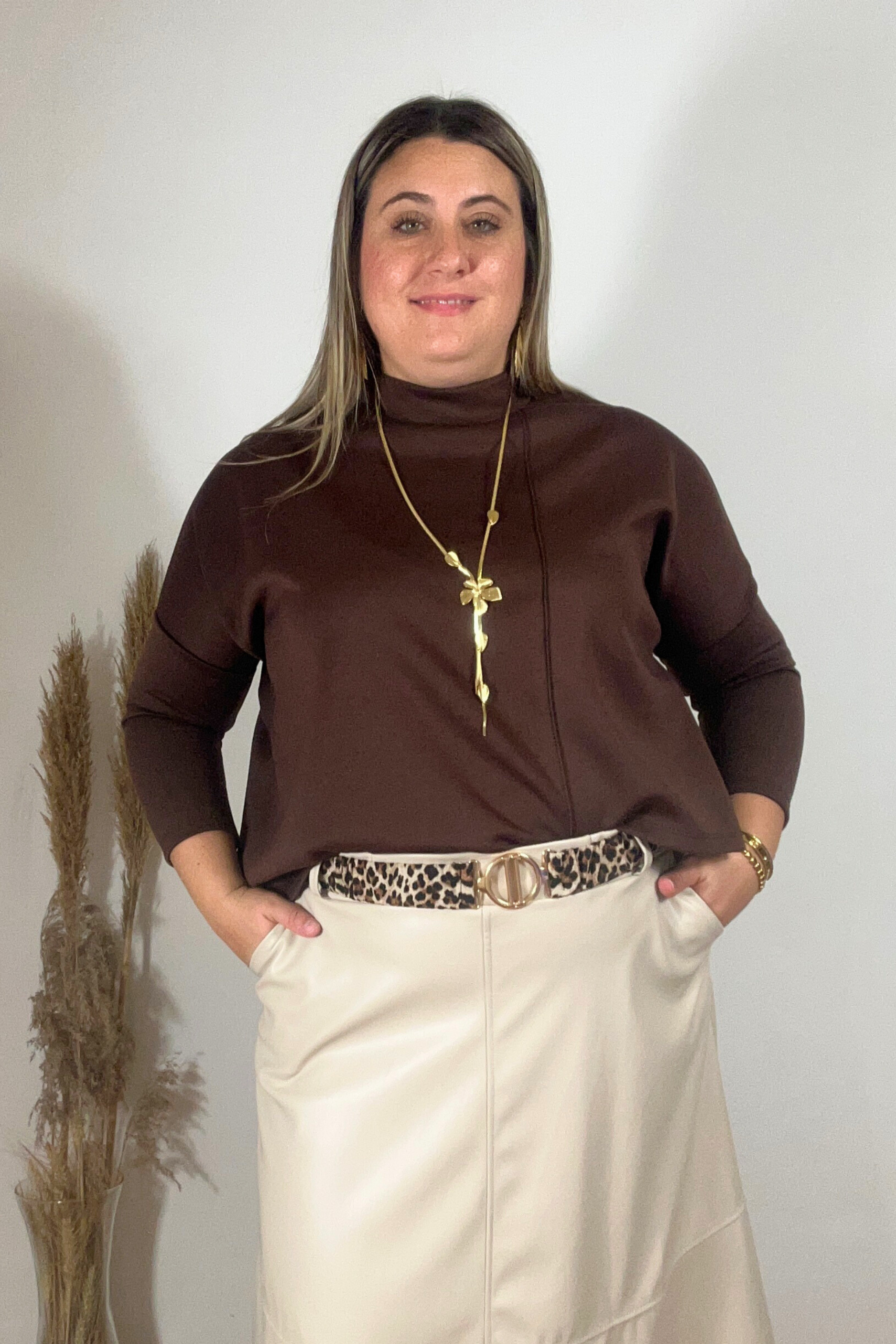 Un jersey marrón-chocolate de viscosa con corte asimétrico y cuellecito delicado, elegante y cómodo para tus looks de día.